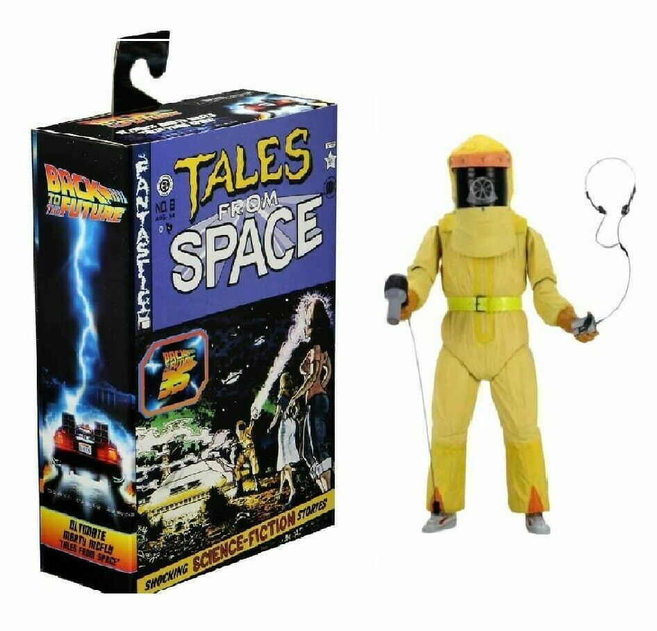 NECA is thrilled to present the Ultimate Tales From Space Marty McFly from Back To The Future featuring the official licensed likeness of Michael J. Fox. Equipped with a hair dryer and brain melting device known as a cassette player, Marty is dressed in a hazmat suit with interchangeable heads & hoods to portray his appearance as the visitor from planet ” Vulcan”.