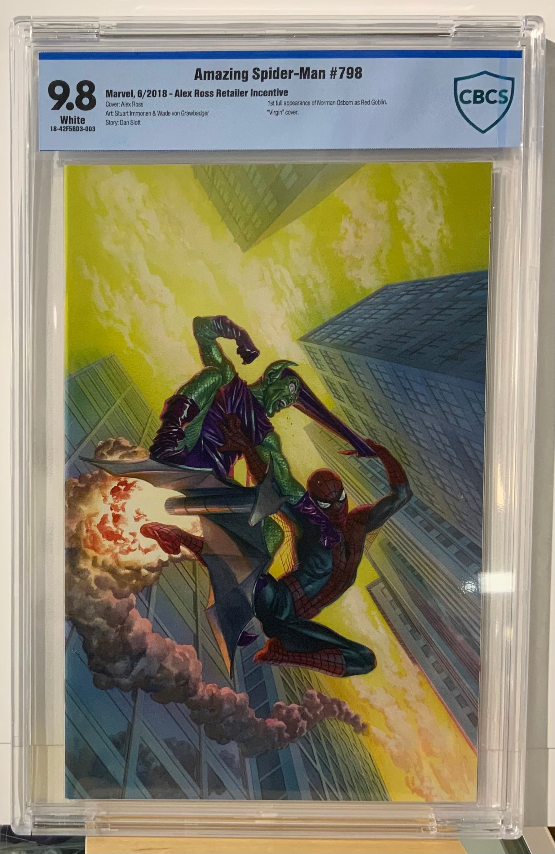 Limited 1 for 100 Retailer Incentive Variant Cover. Written by Dan Slott. Art by Stuart Immonen. Cover by Alex Ross. GO DOWN SWINGING Part 2 - Dan Slott's final SPIDER-MAN story continues! The GREEN GOBLIN HAS RETURNED - and he's exacting his ultimate revenge not only on SPIDER-MAN, but on everyone the wall-crawler loves! Norman Osborn's offering NO QUARTER, an ultimatum that threatens to finish PETER PARKER once and for all! 28 pages, full color. Rated T CBCS 9.8