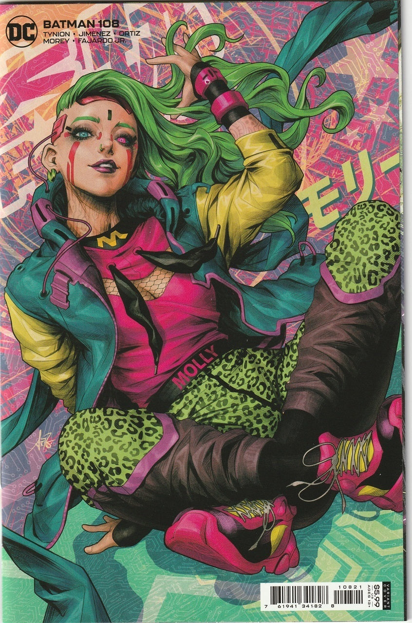 Written by James Tynion IV. Art by Jorge Jimenez, Ricardo Lopez Ortiz. Cover by Stanley Artgerm Lau. Batman goes undercover to infiltrate the transhumanist gang known as the Unsanity Collective and learn more about their sudden appearance in Gotham. And what nefarious plans does Simon Saint have for Arkham Day survivor Sean Mahoney? How does it connect to the Magistrate? And in part two of the action-packed, bone-rattling Ghost-Maker backup story...can our hero stand up to the horror of Kid Kawaii? Plus, dont miss the debut of the mysterious Miracle Molly! 40 pages, full color. Rated T+ Cover price $5.99.