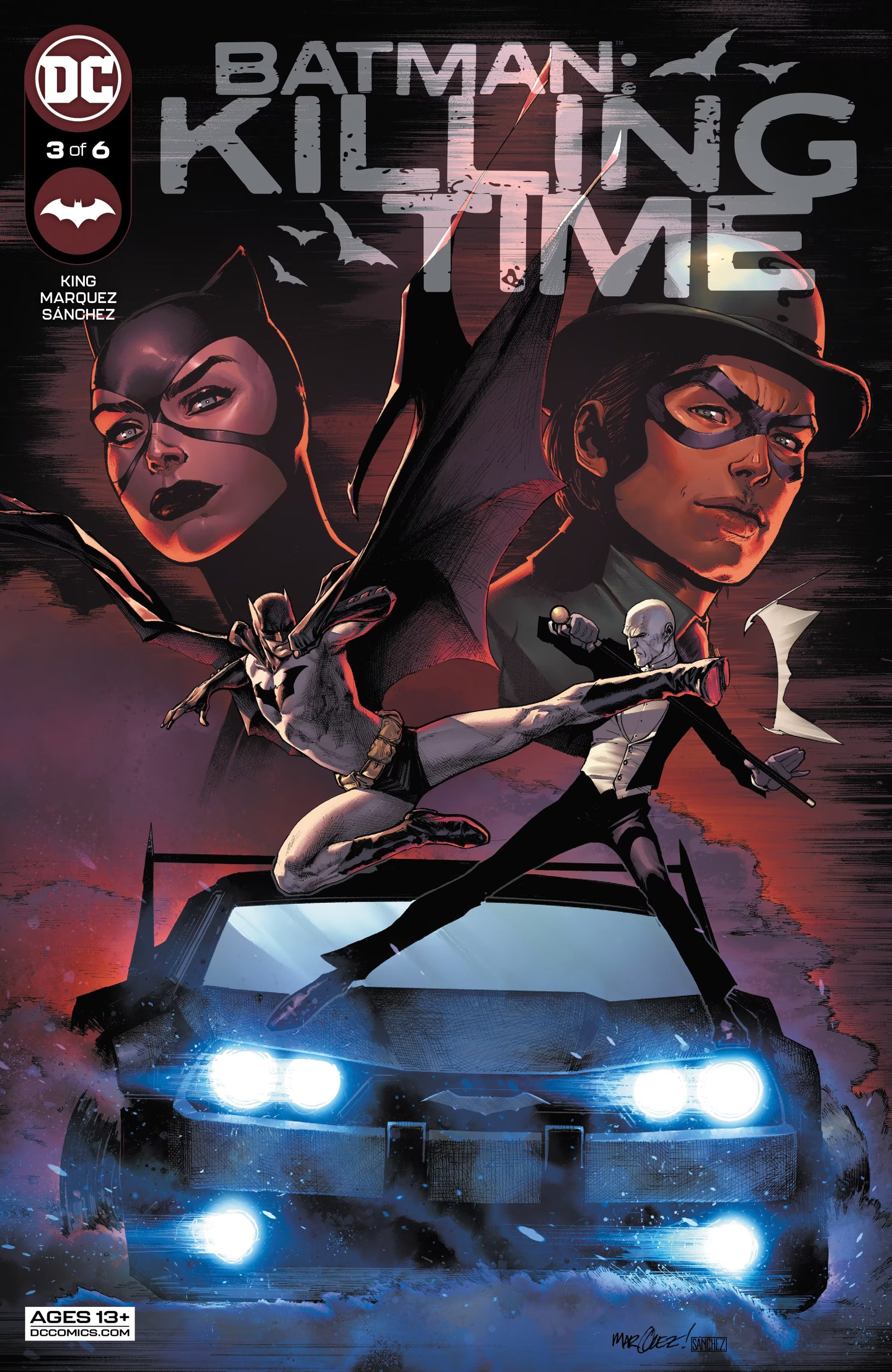 Written by Tom King. Art and Cover by David Marquez. Three villains, one Dark Knight, and a deadly heist gone wrong. Catwoman, the Riddler, and the Penguin join forces to pull off the greatest robbery in the history of Gotham City. And their prize? A mysterious and priceless artifact in the secret possession of Bruce Wayne! But, as the events unfold, what fun is a heist without a bloody double cross or two? The blockbuster team of Tom King and David Marquez bring an epic, white-knuckled, action-packed tale of a young Batman desperate to recover his most prized possession from a host of violent rogues before the clock strikes the Killing Time... 40 pages, full color. Rated T+ Cover price $4.99.