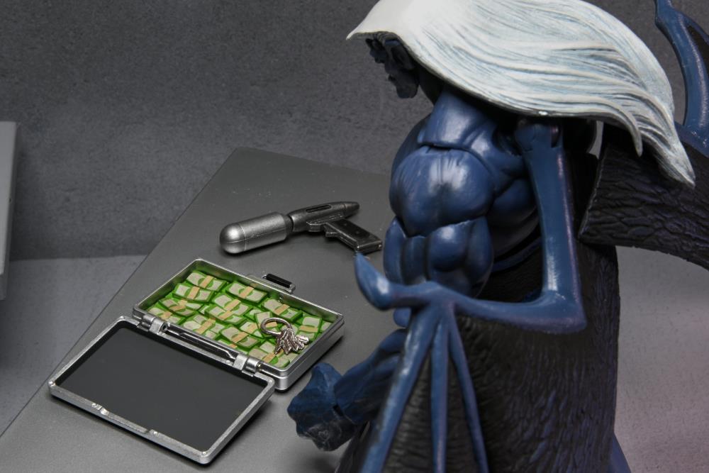 Thailog was created with genetic material stolen from clan leader Goliath - as a result he is just as strong and intelligent but utterly evil thanks to Xanatos' subliminal indoctrination. The Thailog action figure measures 8 inches with a wingspan of 16 inches! The figure features full articulation, including on wings and tail, and comes with plenty of accessories: briefcase with removable money, flare gun, and interchangeable heads and hands.