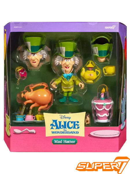 From Super7. Just as he appears in Disney's Alice in Wonderland, the Mad Hatter ULTIMATES! deluxe action figure has everything you need to throw an amazing tea party! This 7" highly-articulated, made-to-order Mad Hatter figure comes with a soft goods coat, alternate heads and hands, and additional iconic accessories so you can celebrate 70 years of Disney's Alice in Wonderland, and your unbirthday too.