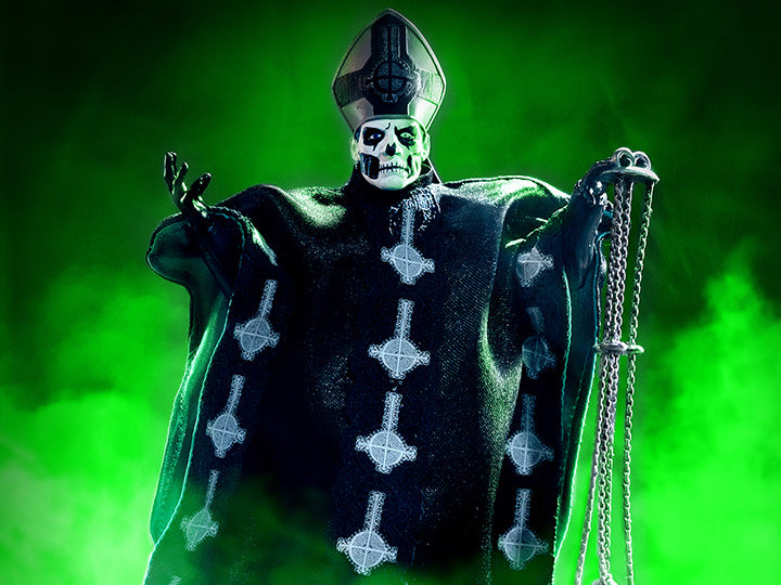 This made-to-order deluxe 7” scale highly articulated figure features Papa Emeritus II from the Infestissumam album era in both his onstage and unmasked guises. The figure is lavishly detailed and painted and features an epic assortment of interchangeable accessories.