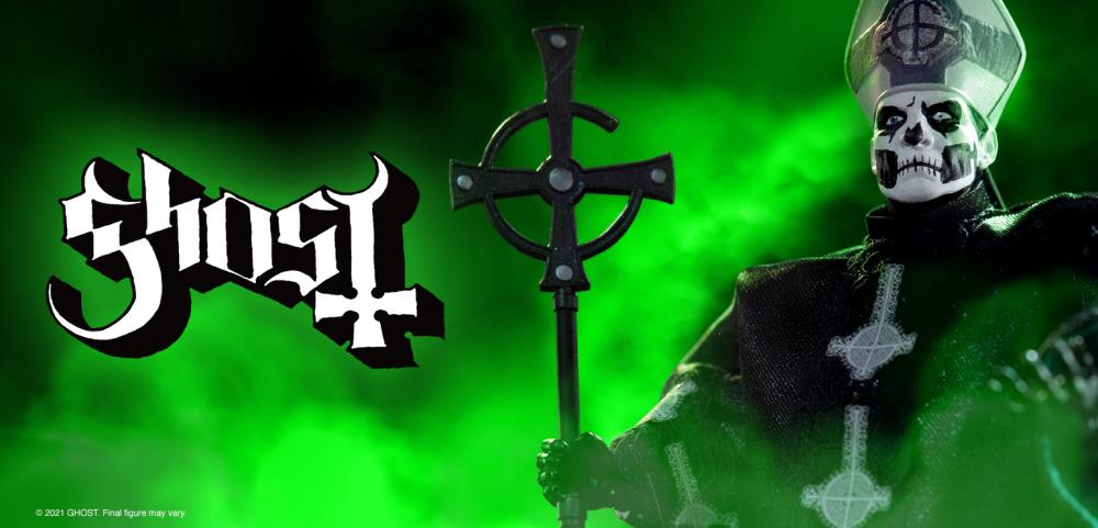 Welcome Year Zero!” Papa Emeritus II, the 2nd incarnation of Ghost’s leader, succeeded his older brother Papa Emeritus I during the Infestissumam album era of the band. Under Papa II’s charismatic leadership, Ghost increased its international fame and followers with live performances enhanced by a series of personal appearances and propaganda videos as his unmasked self. Papa Emeritus II’s reign ended publicly onstage in Sweden at the final show of Ghost’s 2015 World Tour. Super7 is honored to commemorate Papa Emeritus II in the ULTIMATES! Figure world!