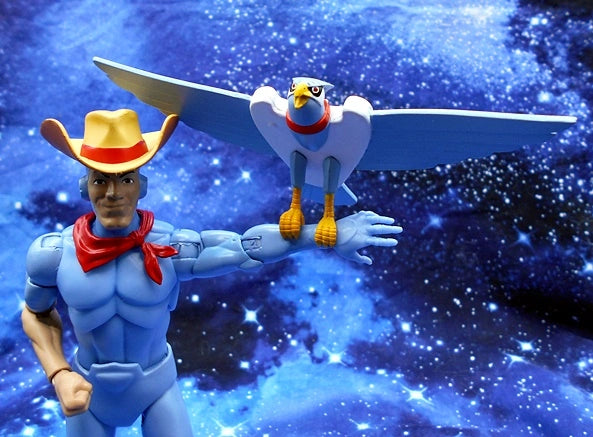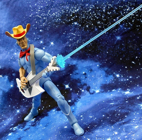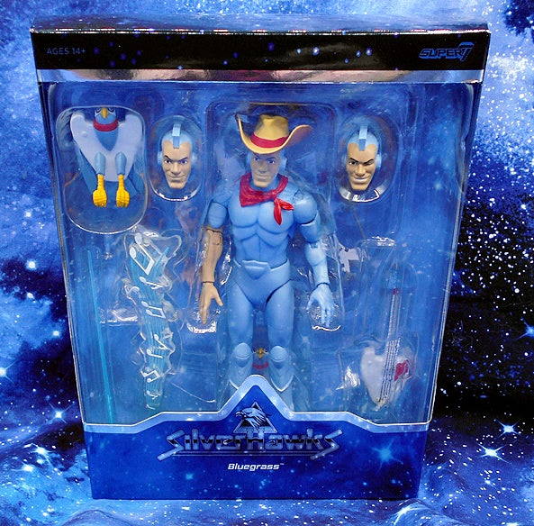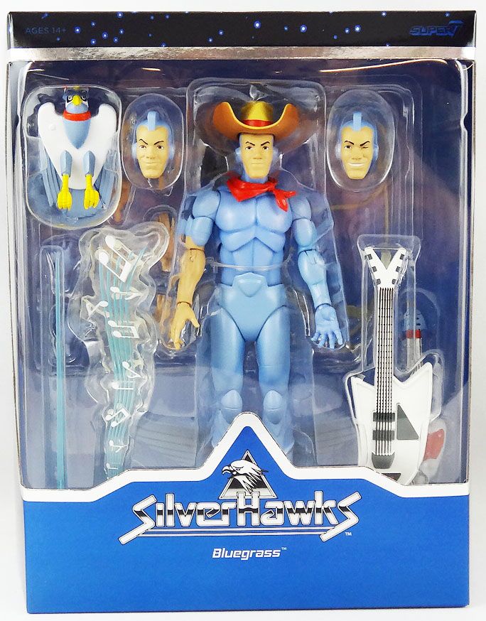 From Super7. Bluegrass is the only SilverHawk whose cyborg enhancements don't include wings or built-in weapons, but he's an ace pilot who - with his Hot Licks guitar and "bird" partner Sideman - helps keep Limbo safe from Mon*Star and his mobsters! This made-to-order 7" scale fully articulated SilverHawks ULTIMATES! figure of Bluegrass features premium detail and comes with interchangeable heads & hands, and a variety of other accessories, including a Hot Licks guitar, a pair of lassos, and a trio of Side Man figures. Adding Bluegrass to your collection will be just the tuneup that your collection needs, so snag this Bluegrass ULTIMATES! figure before it flies away!