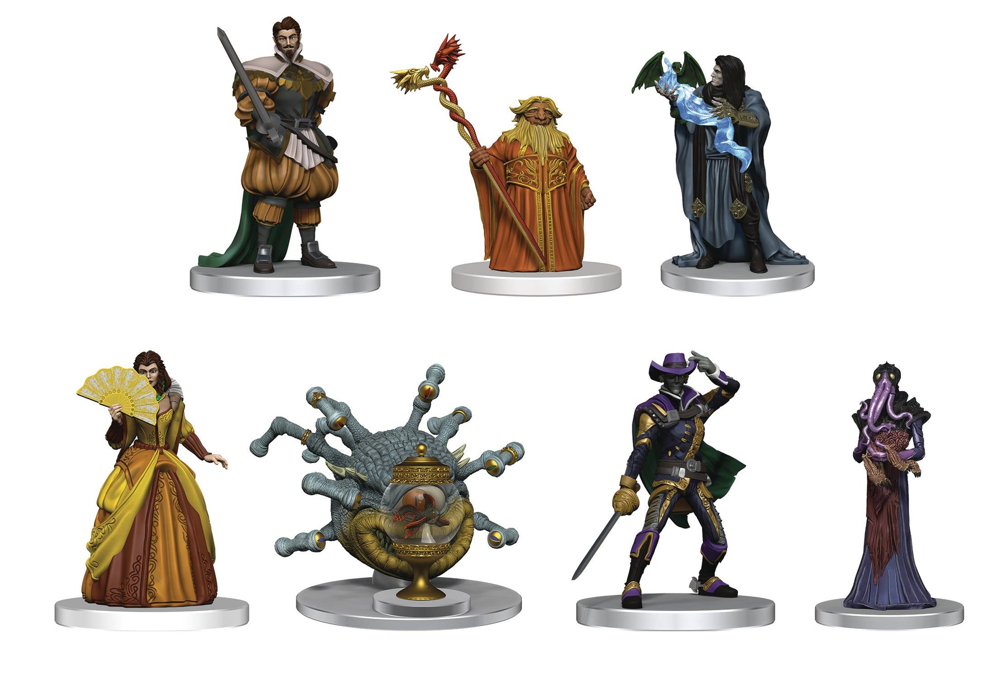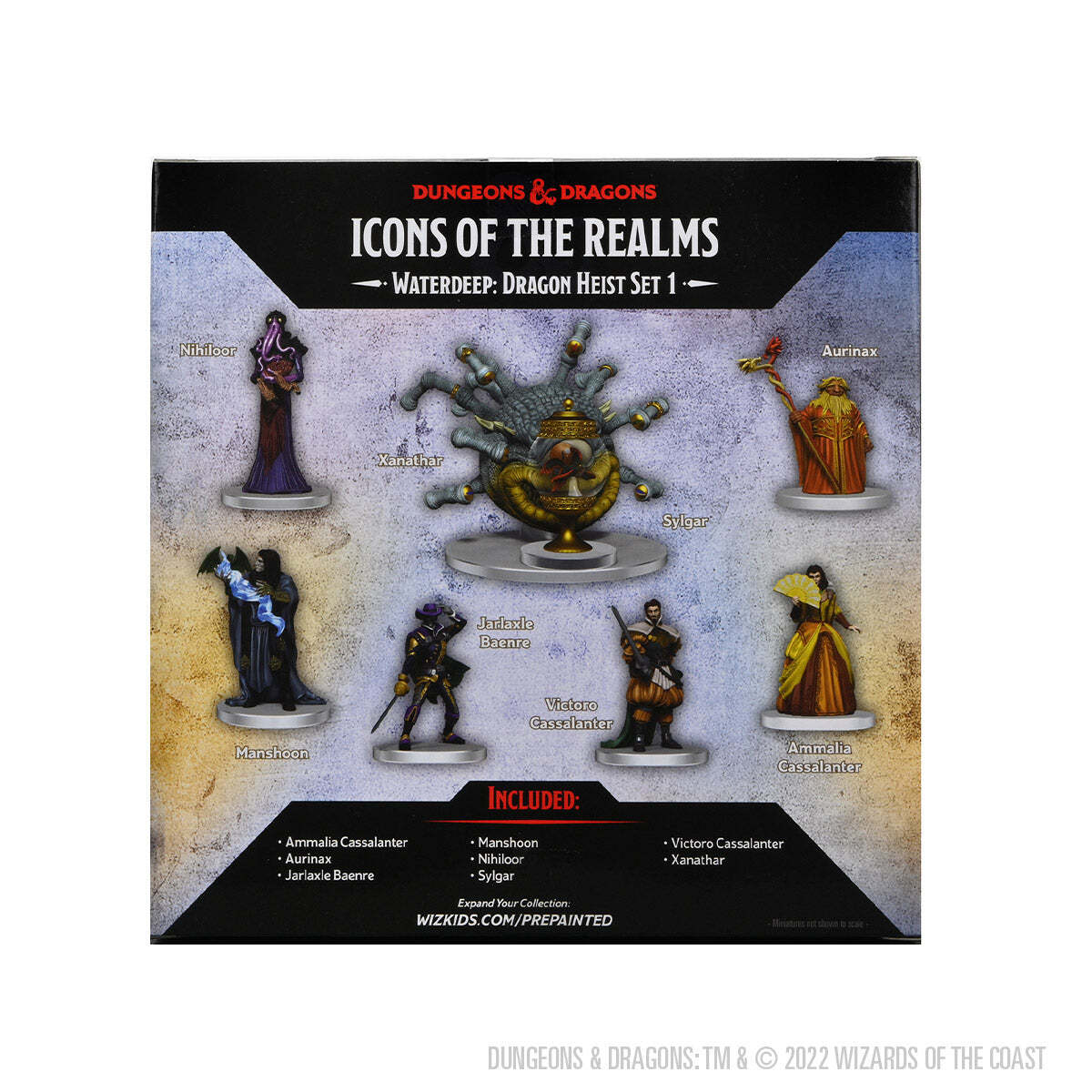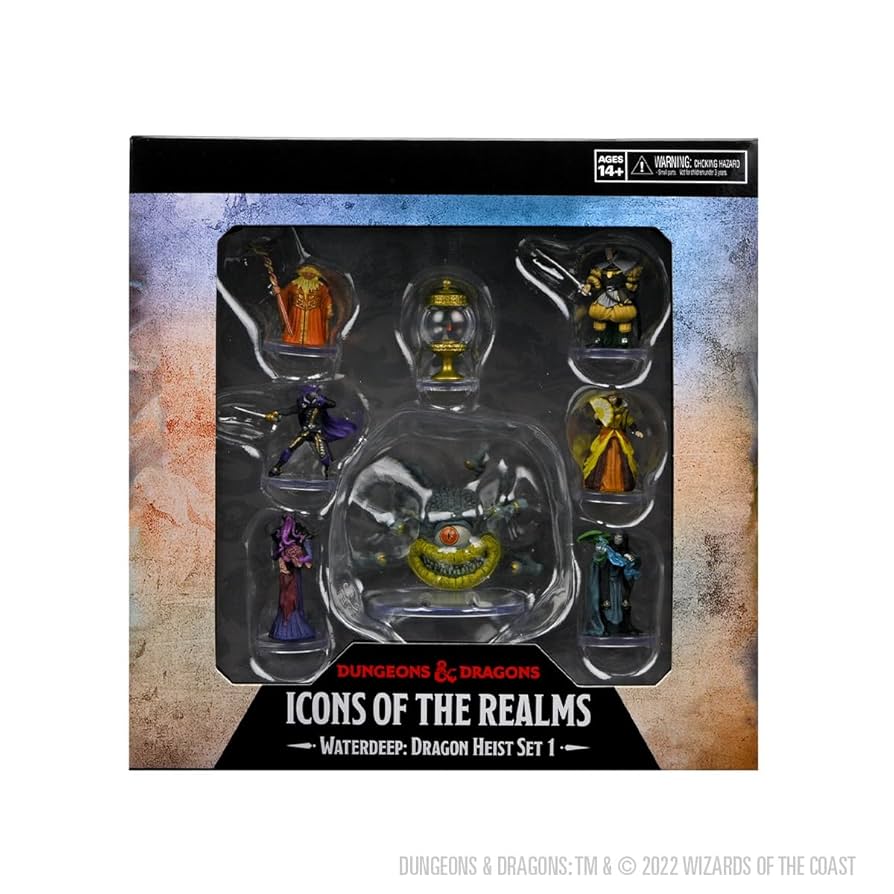 A grand urban caper awaits you. Pit your skill and bravado against villains the likes of which you've never faced before, and let the dragon hunt begin! Within this box, you will find some of Waterdeep's most terrifying foes, as well as some of its legendary heroes. Excite your players with these collections of 8 highly detailed miniatures and start building your own legendary story today. Box set 1 includes: Aurinax, Nihiloor, Xanathar, Sylgar, Victoro Cassalanter, Ammalia Cassalanter, Jarlaxle Baenre, and Manshoon. Box set 2 includes: Nimblewright, Saeth Cromley, Barnibus Blastwind, Urstul Floxin, Drow Gunslinger, Yalah Gralhund, Orond Gralhund. Contents subject to change.