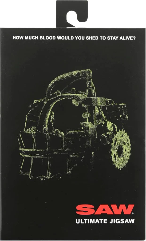 In the Saw movies, The Jigsaw Killer abducts the morally wayward in a twisted attempt to teach his victims the value of life. Once captured, his prisoners must face impossible choices in a horrific game of survival as he communicates with them through an eerie puppet. This 7” Saw action figure in a black robe gets the Ultimate treatment, with a fully articulated body under a wired fabric robe. Accessories include: interchangeable heads and hands, pig-mask head, puzzle head-trap, tape recorder, extended blade, and Billy the Puppet with Trike. Collector-friendly window box packaging with opening front flap.