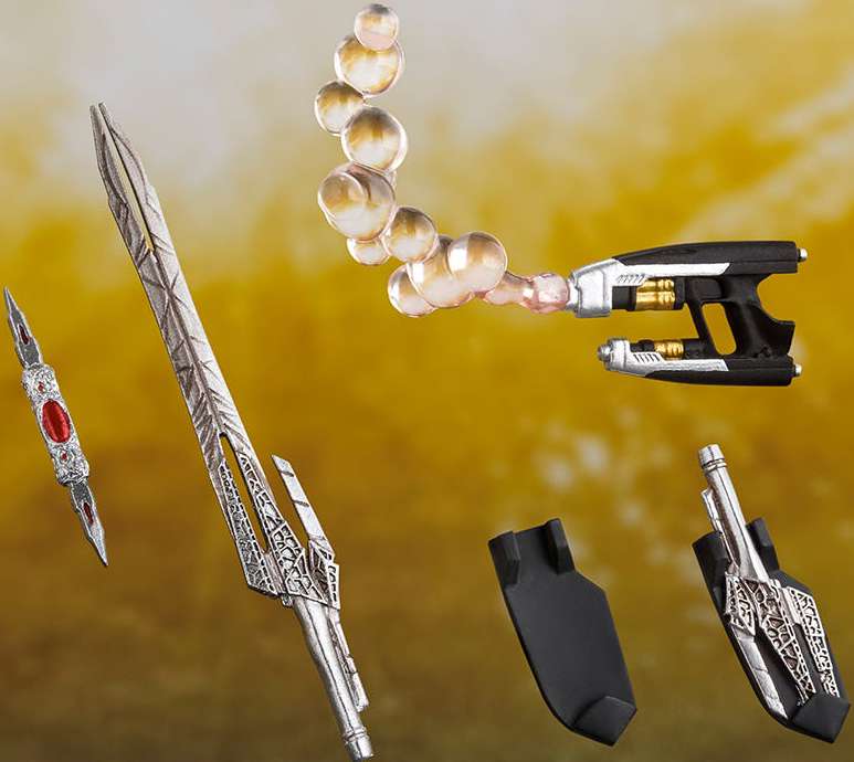 Guardians of the Galaxy's Gamora joins S.H.Figuarts! The figure includes both her sword and the knife she received from Thanos as a girl. Even better, the set comes with Star-Lord's blaster and bubble effect parts, letting you re-create the dramatic scene between the pair on Knowhere (S.H.Figuarts Star-Lord figure sold separately). [Set Contents] Main body, Two optional face parts, Three left and two right optional hands, Knife, Optional hair part, Star-Lord blaster with bubble effect, Sword, Holster (for Sword), Stand *S.H.Figuarts Star-Lord figure not included.