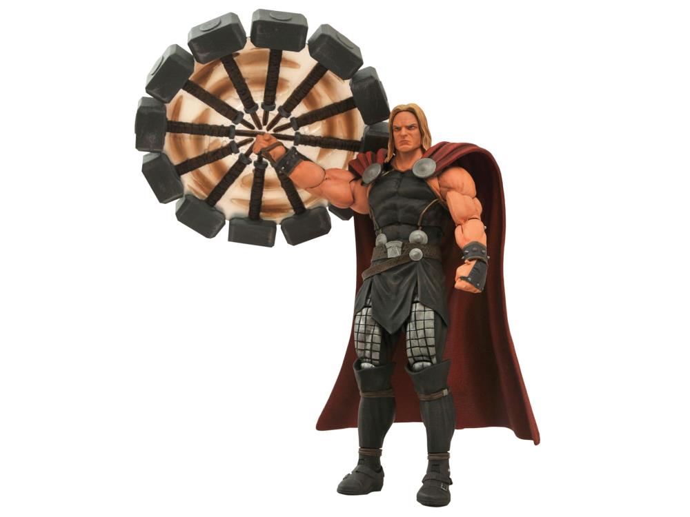Summon Mjolnir with this Might Thor figure! Descending from Asgard, this highly detailed figure of Thor, God of Thunder, features multiple interchangeable parts including Mjolnir, a spinning hammer effect, and an alternate unhelmeted head. Measuring approximately 8" tall, this fully poseable figure has 16 points of articulation, and comes packaged in display-ready Select action figure packaging.