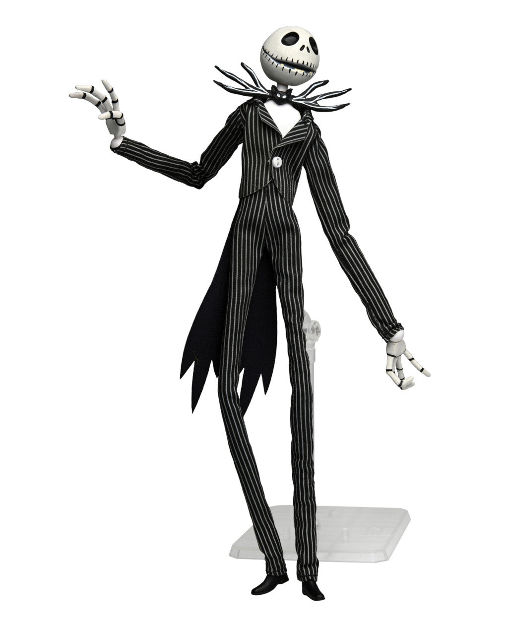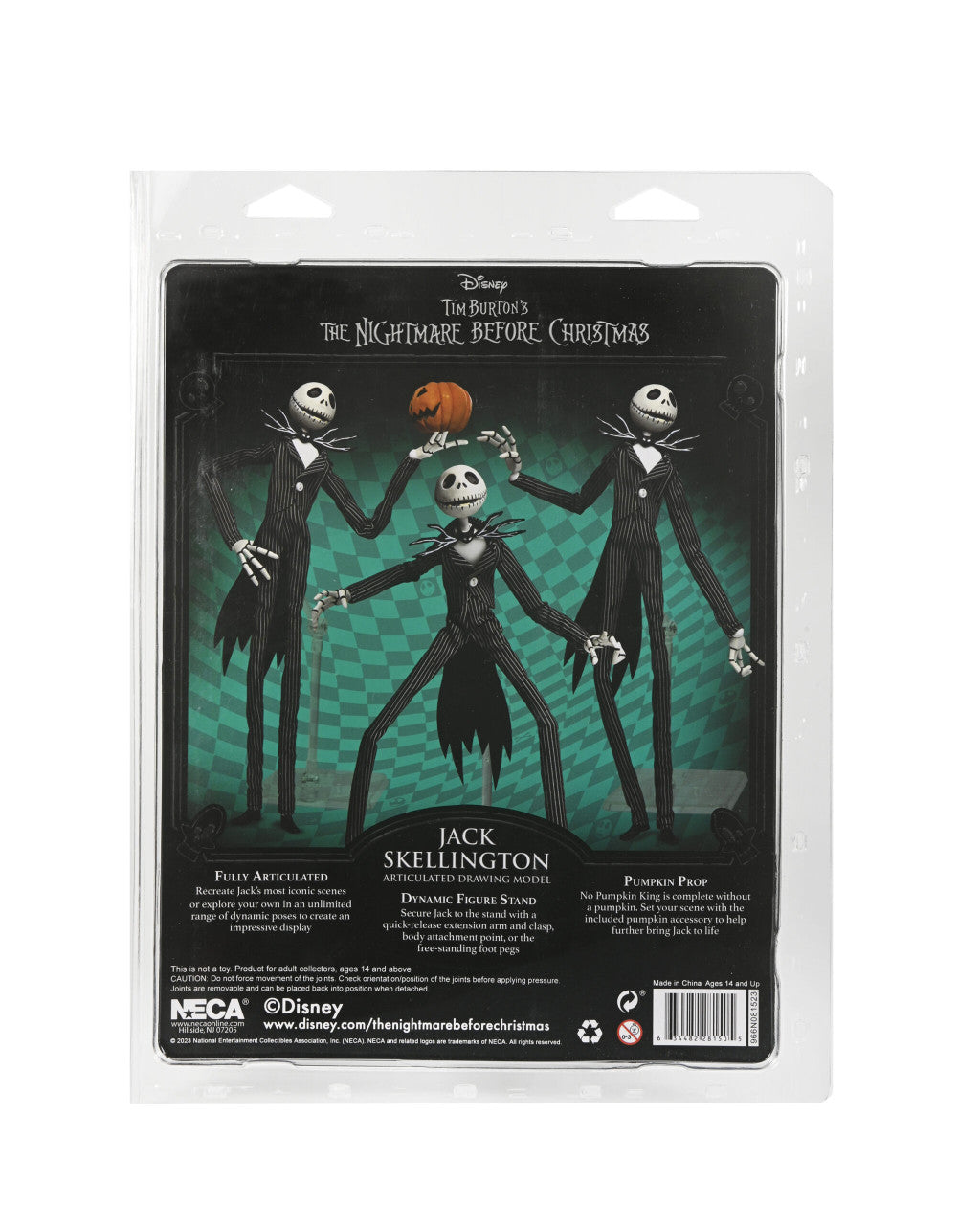 From NECA. Celebrate the 30th anniversary of Disney's Tim Burton's A Nightmare Before Christmas with this new Jack Skellington articulated figure! This frightful fellow is dressed in fabric clothing and stands 9" tall. His fully articulated body has an attachable display stand to let you create a wide variety of delightfully expressive poses and comes with a pumpkin accessory. Resealable clamshell packaging.