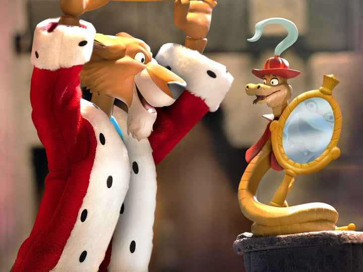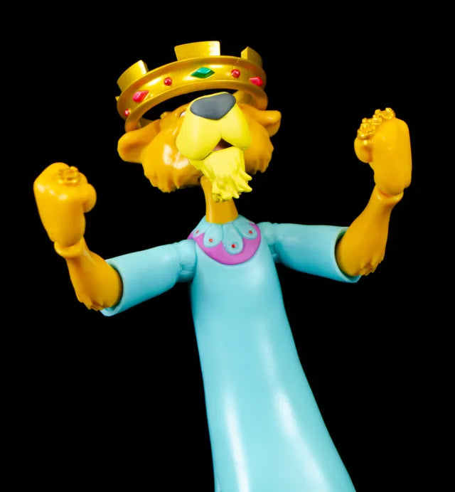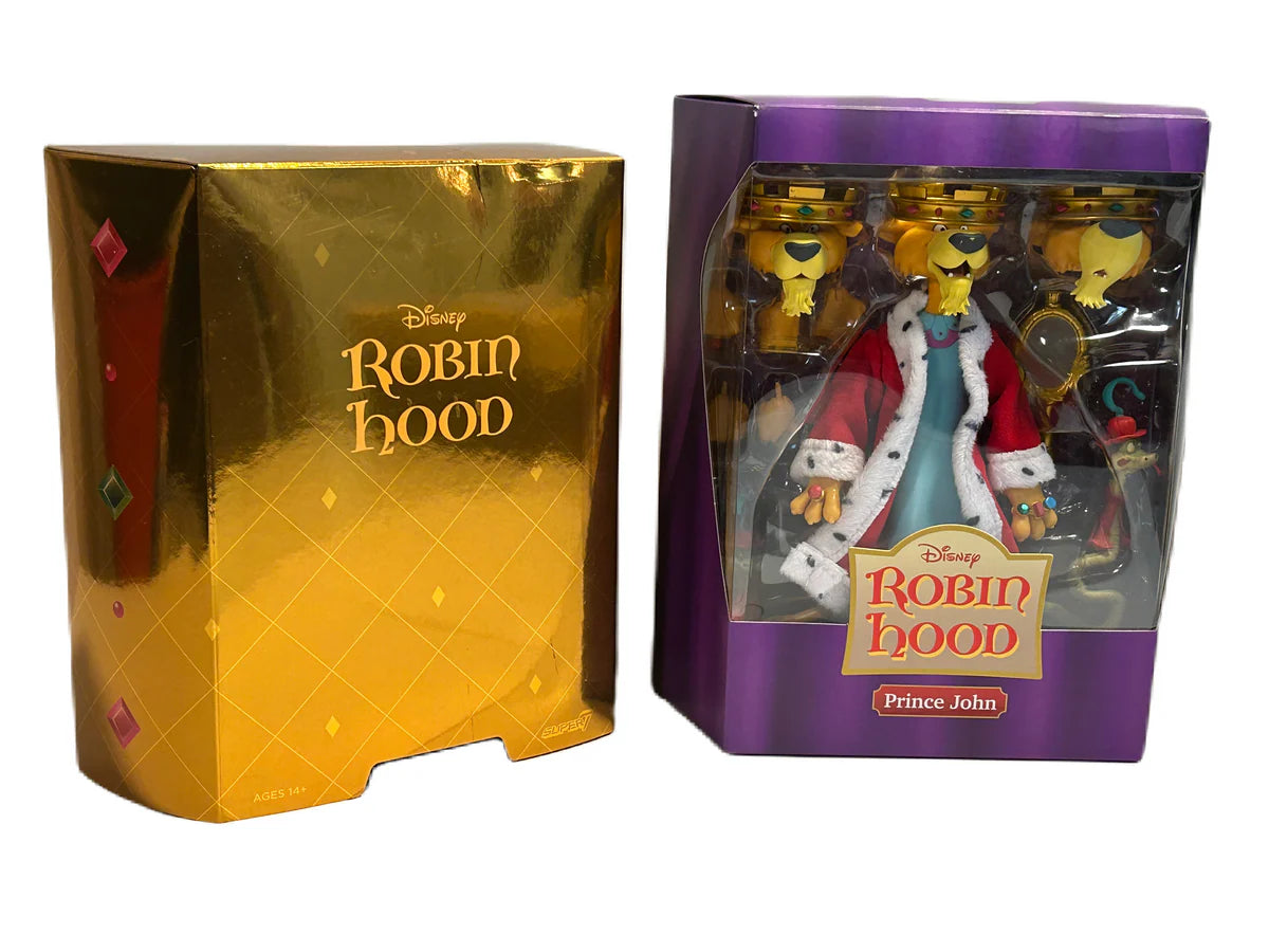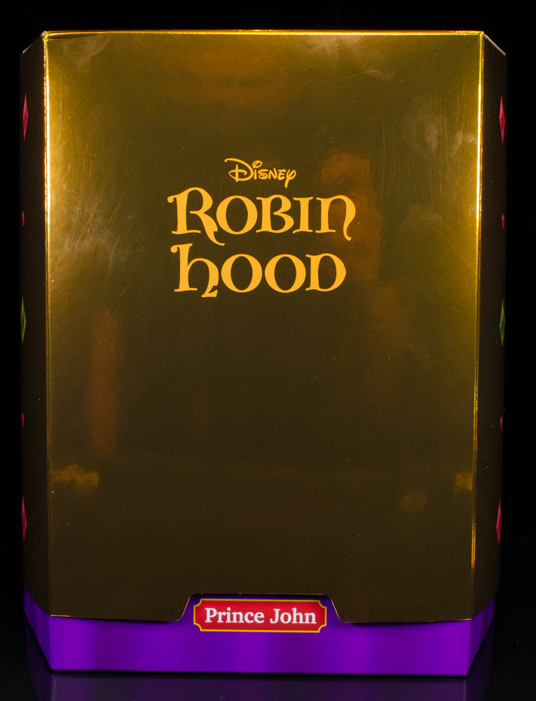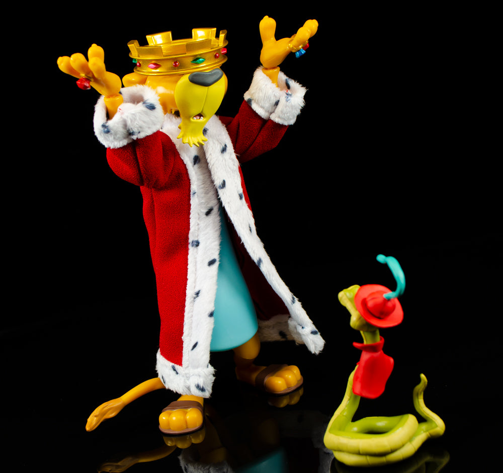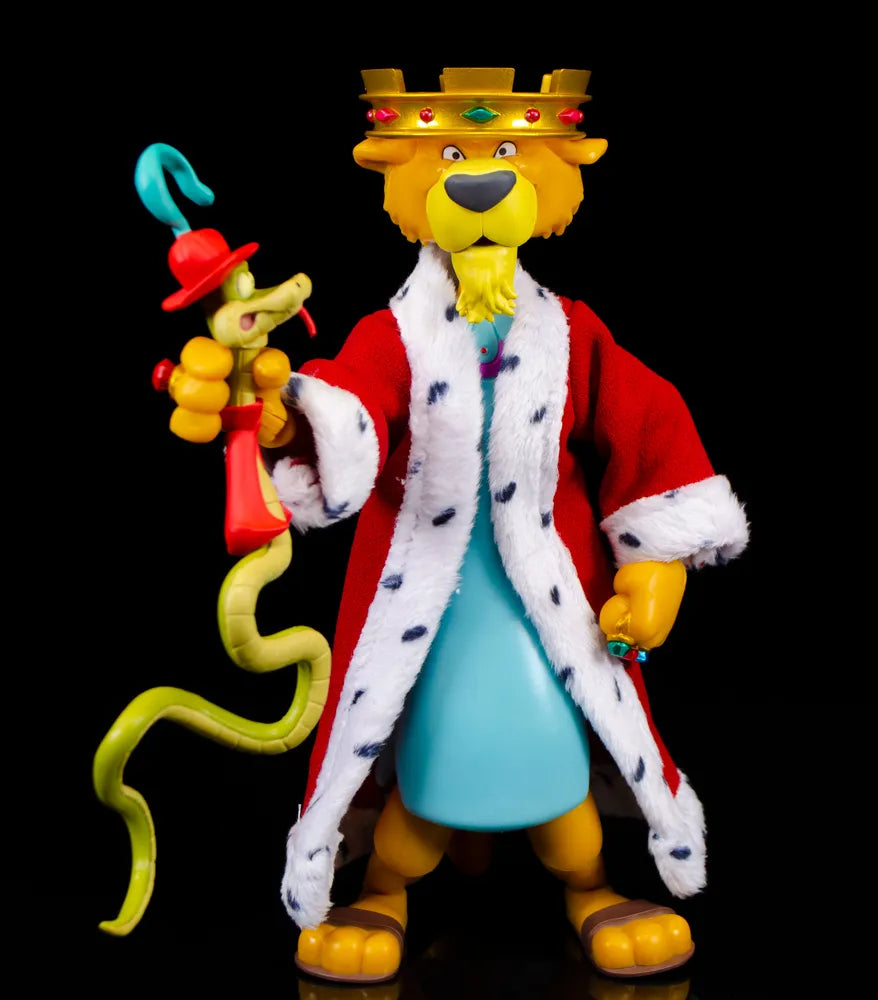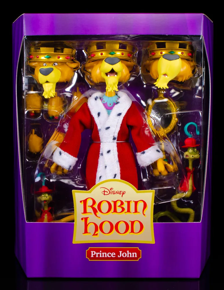 The Prince John Ultimates! figure is super poseable and features 3 interchangeable heads, interchangeable hands (with and without the jewels of his rings), 2 versions of his slithering assistant Sir Hiss, a vanity mirror, and a plush velvet robe with a fur trim.