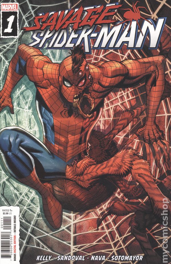 Written by Joe Kelly. Art by Gerardo Sandoval. Cover by Nick Bradshaw. SPIDER-MAN LIKE YOU'VE NEVER SEEN HIM BEFORE! Peter Parker finds himself at the middle of the biggest, most wide-ranging adventure he's ever had and out of the gate it has turned him into a SAVAGE BEAST! Forget everything you know about Spider-Man. All rules and regulations are out the door and Peter Parker may never be the same! 28 pages, full color. Rated T+ Cover price $3.99.