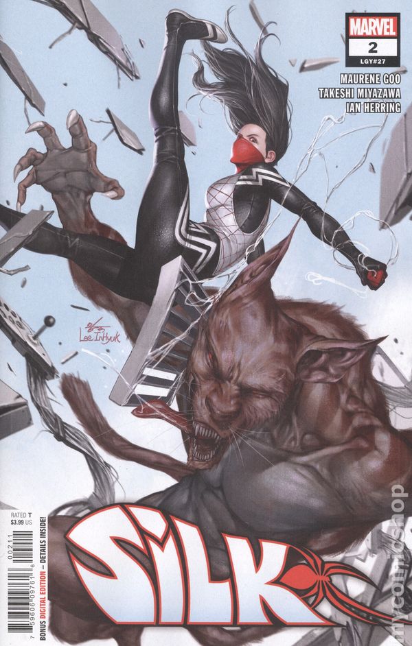 Written by Maurene Goo. Art by Takeshi Miyazawa. Cover by Inhyuk Lee. Someone is killing gangsters in Queens, leaving behind a trail of blood and…fur? Now Silk has to protect these low-level criminals from a bigger, nastier villain. Can she use her sleuthing skills to figure out who's behind it all and stop them before it's too late? 28 pages, full color. Rated T Cover price $3.99.