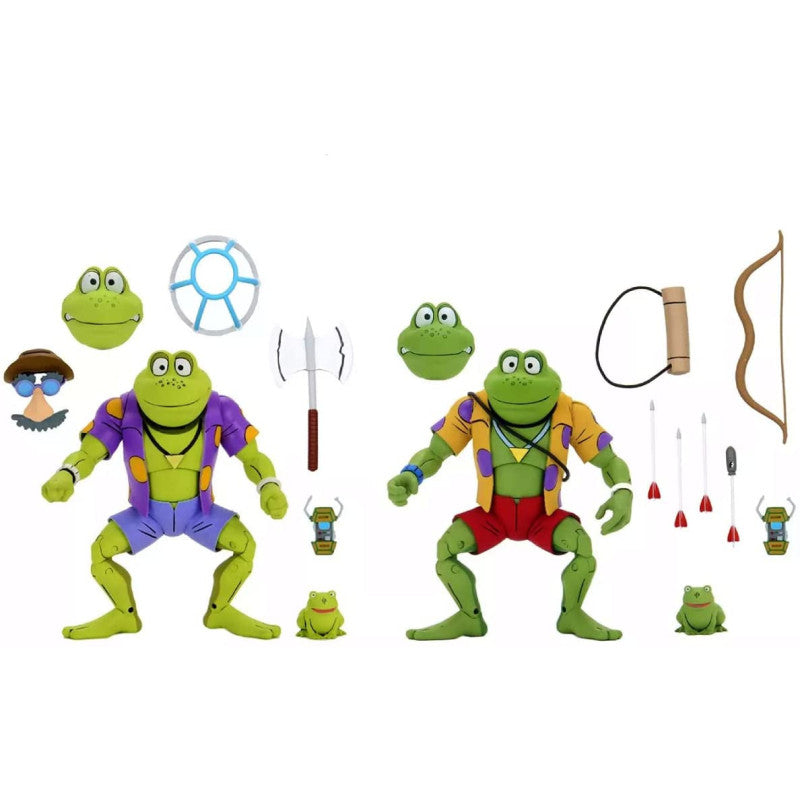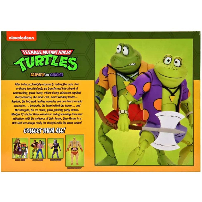 Based on the classic 1980s Teenage Mutant Ninja Turtles cartoon series! After being accidentally exposed to radioactive ooze, four ordinary household pets are transformed into a band of wisecracking, pizza-loving, villain-dicing adolescent reptiles! Whether it's facing fierce enemies or saving humanity from near extinction, with the guidance of their Sensei, these Heroes in a Half Shell are always ready for straight outta the sewer action! Designed to be Shredder's amphibian counterparts to the turtles, the long-awaited Punk Frogs are uniting with the heroes in a half shell, starting with Genghis and Rasputin! Crammed with accessories, this 2 pack comes with interchangeable heads and hands, a bow and arrow, quiver, ax, disguise glasses, mini frogs, communicators, and more! Comes in collector-friendly window box packaging..