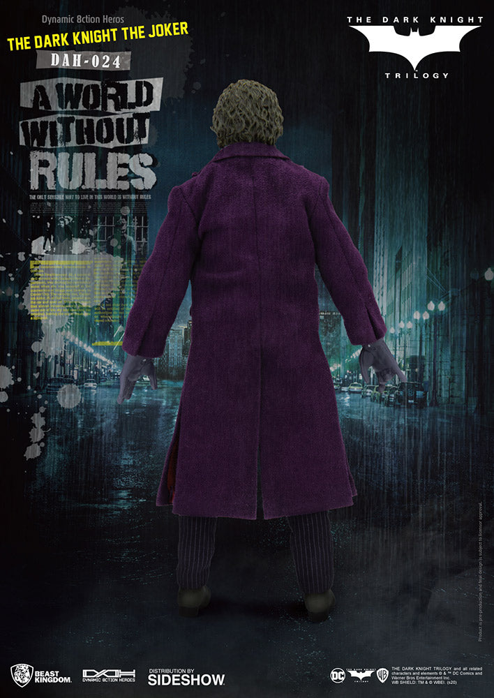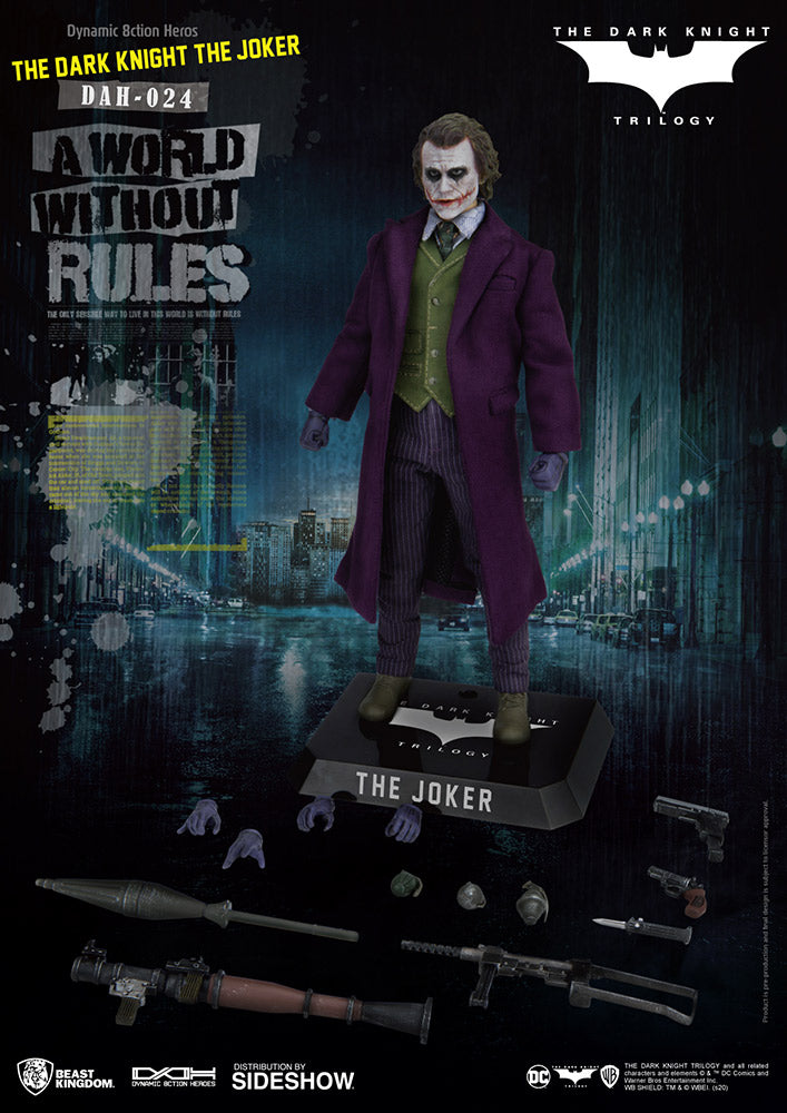 Sideshow and Beast Kingdom, The Entertainment Experience Brand, are proud to introduce the latest D.A.H (Dynamic 8ction Heroes) action figure from the second in Christopher Nolan’s Batman trilogy. The Dark Knight: Joker has 28 points of articulation, giving fans and collectors the very best in posable, realistic design. Conversely a huge amount of focus is given to The Joker’s clothing, something the character himself took great pride in. Everything from the stitching down to the detailed buttons, a real metallic chain, and more are beautifully recreated. A detailed head sculpt brings The Joker’s manic look to real life. Finally not forgetting the D.A.H signature inclusion of a bevy of accessories, including four sets of hands, pistols, bazookas, hand grenades, and more, means collectors are in no shortage of ways to pose and recreate their favorite scenes from the movie.