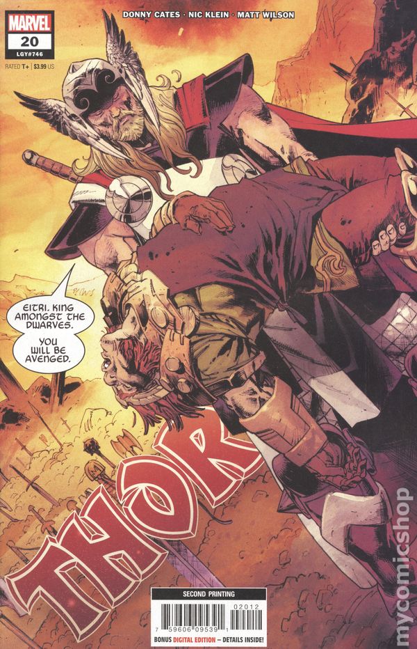 2nd Printing. God of Hammers: Part 2 of 5 - Written by Donny Cates. Art by Nic Klein. Cover by Nic Klein. Mjolinr is on a rampage across the realms and is leaving death and destruction in its path! Thor must act fast to save his kingdom for the deadly prophecy of the God of Hammers is about to be unleashed! 28 pages, full color. Rated T+ Cover price $3.99.
