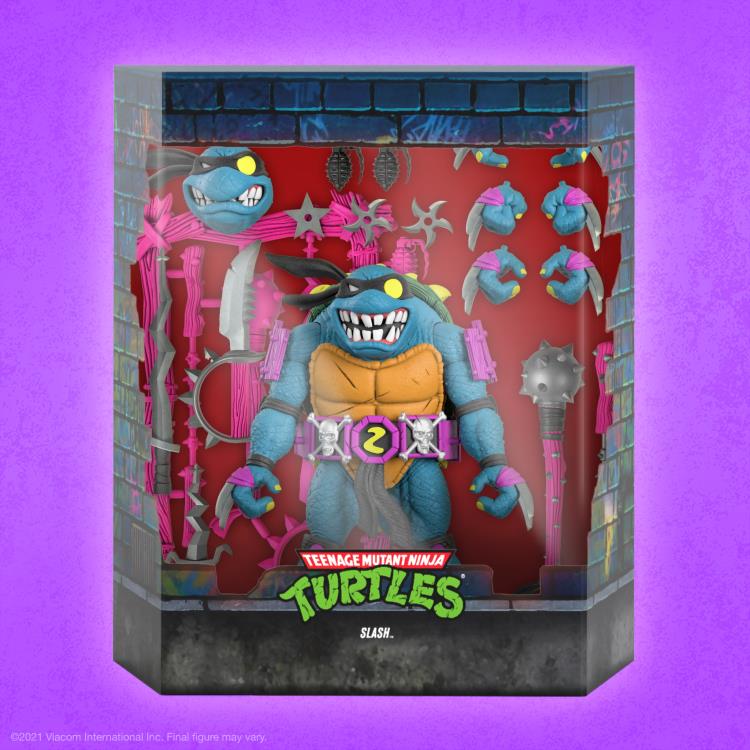 The Evil Turtle from Dimension X! Between his spiky shell, claws, and blade-adorned hands - and not to mention, his bad attitude - it’s easy to see how Slash got his name. This 7” scale fully articulated Teenage Mutant Ninja Turtles ULTIMATES! figure of Slash features battle damage and scaly skin detail, as well as interchangeable heads and hands, and a weapon rack chock full of mayhem-making accessories. He may hate pizza, parties, and pranks, but give the guy a chance and add the Teenage Mutant Ninja Turtles ULTIMATES! figure of Slash to your collection anyway!