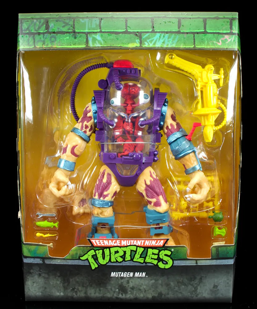 From Super 7. Relive the fun and excitement of the classic Teenage Mutant Ninja Turtle action figures with these figures from Super 7! Super Seven presents the non-stop mutating monster, Mutagen Man! He includes: Fists (2), Gripping hands (2), Mutagen Machine Gun, Life Support System, Skull Plug, plus a Gooey Garbage Rack Including; Fish, Wrench, Eyeball, Turtle, Pizza, Apple Core, and a Bone!