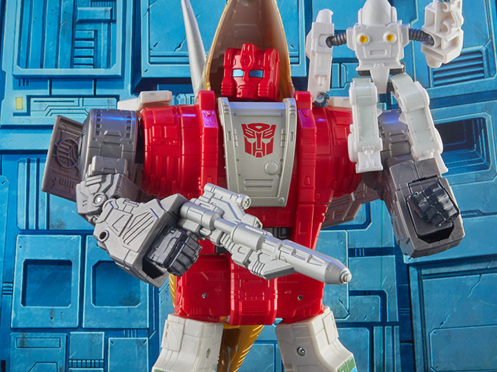 This Studio Series 86-07 Leader Class The Transformers: The Movie-inspired Dinobot Slug figure converts from robot to triceratops mode in 32 steps. Includes non-converting Daniel Witwicky figure that can sit on Dinobot Slug figure in both modes. Remove backdrop to showcase Dinobot Slug and Daniel Witwicky in the Mockery of Justice scene. In the Mockery of Justice scene, the Dinobots storm the Quintesson Courtroom to save Hot Rod and Kup, as Slug stomps over a crushed Quintesson prosecutor. Pose the figures out and re-create this classic movie moment!