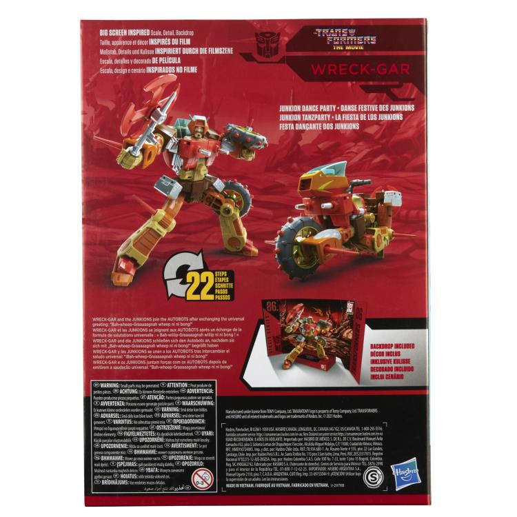 This Studio Series 86-09 Voyager Class The Transformers: The Movie-inspired Wreck-Gar figure converts from robot to motorcycle mode in 22 steps. Remove backdrop to showcase Wreck-Gar in the Junkion Dance Party scene. In the Junkion Dance Party scene from The Transformers: The Movie, Wreck-Gar and the Junkions team up with the Autobots after exchanging the universal greeting: “Bah-wheep-Graaaaagnah wheep ni ni bong!” Figure features an Armor Axe and 2 wheel accessories inspired by the scene in the film.