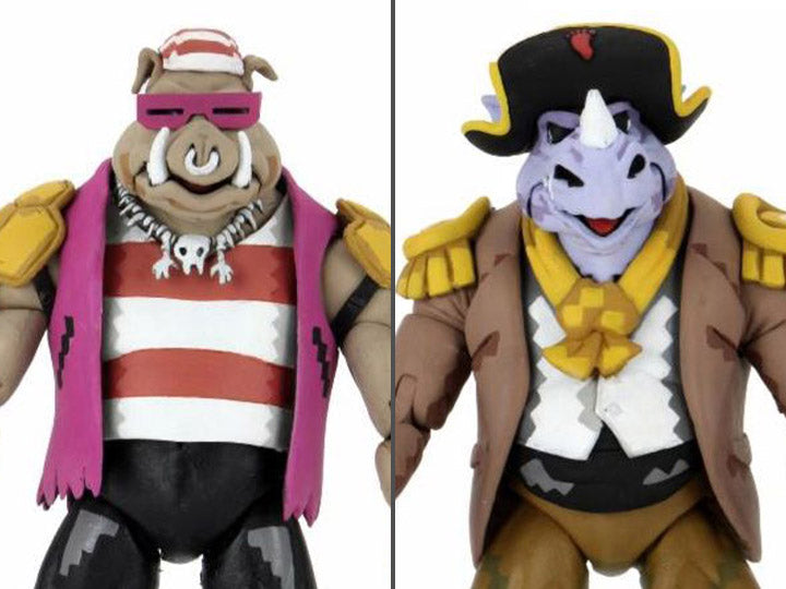 From NECA. You're walking the plank, shell brains! Be prepared to lose a few extra lives against Pirate Bebop & Rocksteady, the first 2 pack coming to NECA's TMNT Turtles In Time line. Equipped with a whip (Bebop) and rapier sword (Rocksteady), this hefty duo is dressed in their pirate outfits, ready to recklessly charge through anyone in their way. Both figures feature special deco that recreates the pixilated look of the video game and comes in window box packaging with graphics from the original arcade cabinet.
