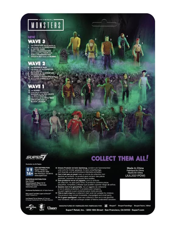 While beauty (or lack thereof) may often only be skin-deep, in the case of Ygor, his twisted physique does not belie the twisted heart of a murderer. This 3.75” articulated Universal Monsters ReAction figure of Ygor depicts Bela Lugosi in one of his most memorable roles and comes on cardback featuring classic Monsters-style artwork by Ed Repka. Given his propensity for using Frankenstein’s monster to seek revenge on those who have wronged him, the prudent move is to stay in his good graces and add the Universal Monsters ReAction figure of Ygor to your collection!